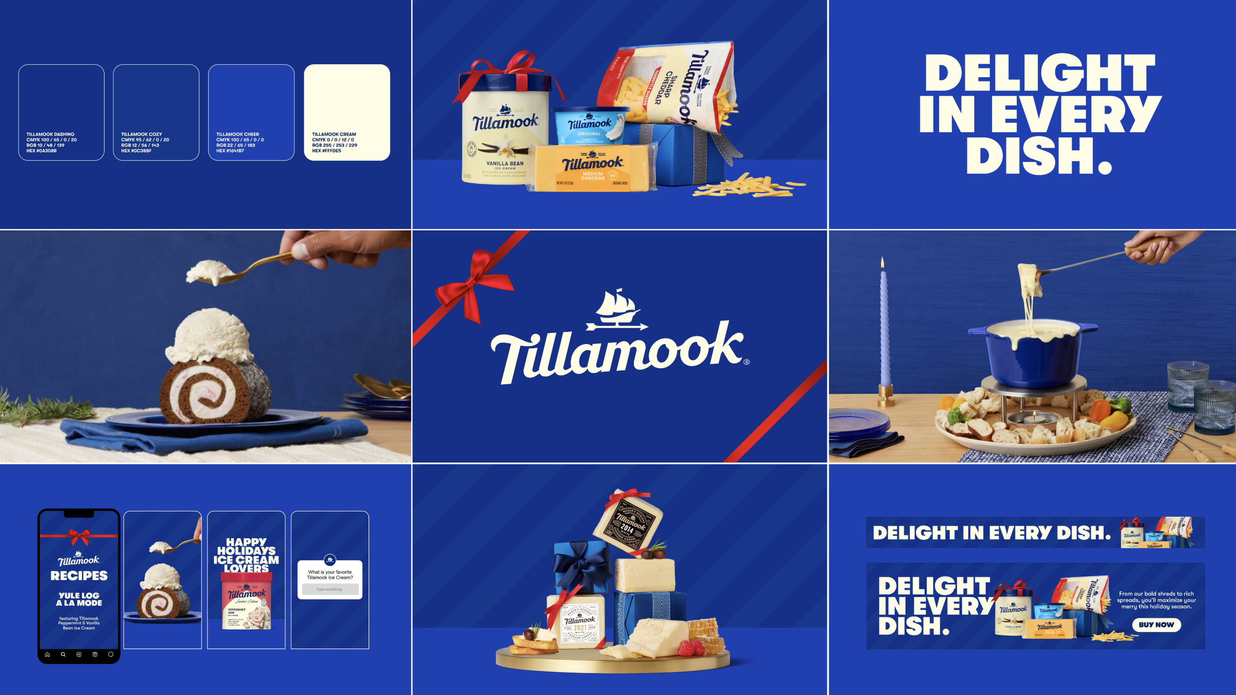 Tillamook County Creamery Association is a farmer-owned co-op that makes premium dairy products. For their 2024 holiday campaign, our strategy was to create photography that disrupted seasonally while staying true to brand. We developed a cohesive color palette that unified their entire product line, moving away from the range of package-based pastel backgrounds so each product could pop against a dark background. Carefully curated props were layered in to communicate holiday entertaining and gift-giving moments. The resulting photography became the visual foundation for the holiday toolkit, supporting all marketing channels and retail signage at the Tillamook Creamery. The campaign's success spoke for itself. Tillamook brought the campaign art direction back for the 2025 holiday season.