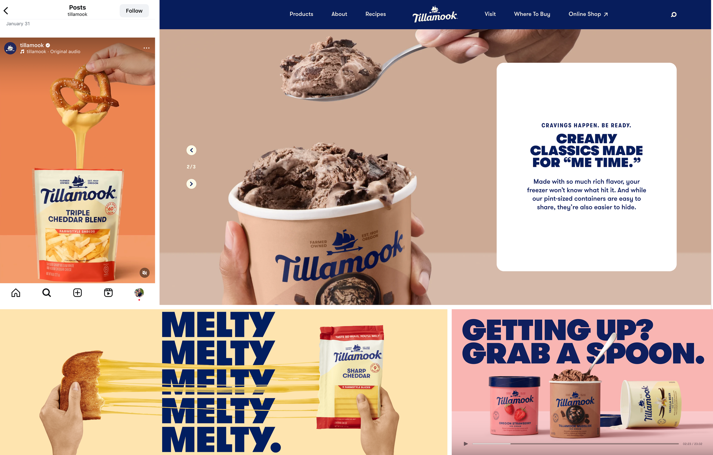 Tillamook County Creamery Association is a farmer-owned co-op that makes premium dairy products. Our strategy was to create photography that supported the marketing channels and featured the Tillamook product as the hero, to create consistent storytelling across the brand. We incorporated colors that complimented the flavors, added simple tonal props to support the storytelling, and focused on moments where the product is being enjoyed.